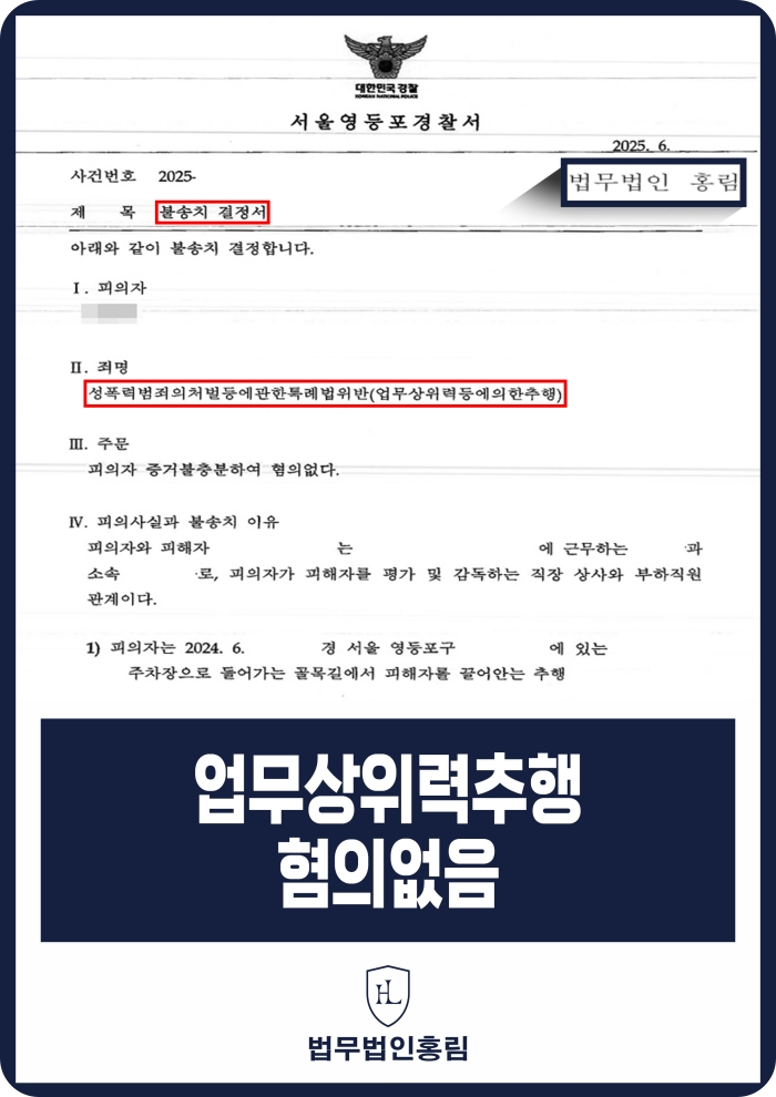 특히 상급자의 지위를 이용하거나 회사 내 권한을 바탕으로 한 행위라면, 피해자의 저항이 어려웠다는 이유로 업무상위력등에의한추행 혐의가 성립될 가능성이 큽니다.