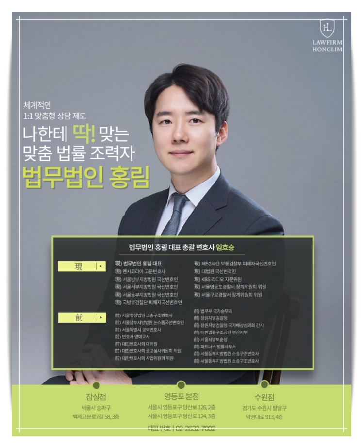 안녕하세요. 법무법인 홍림의 대표 변호사 임효승입니다. 법뭅버인 홍림은 생활 속 법률상담에서 형사, 민사, 가사, 행정소송에 이르기까지 의뢰인이 만족할 수 있도록 성심을 다하고 있습니다