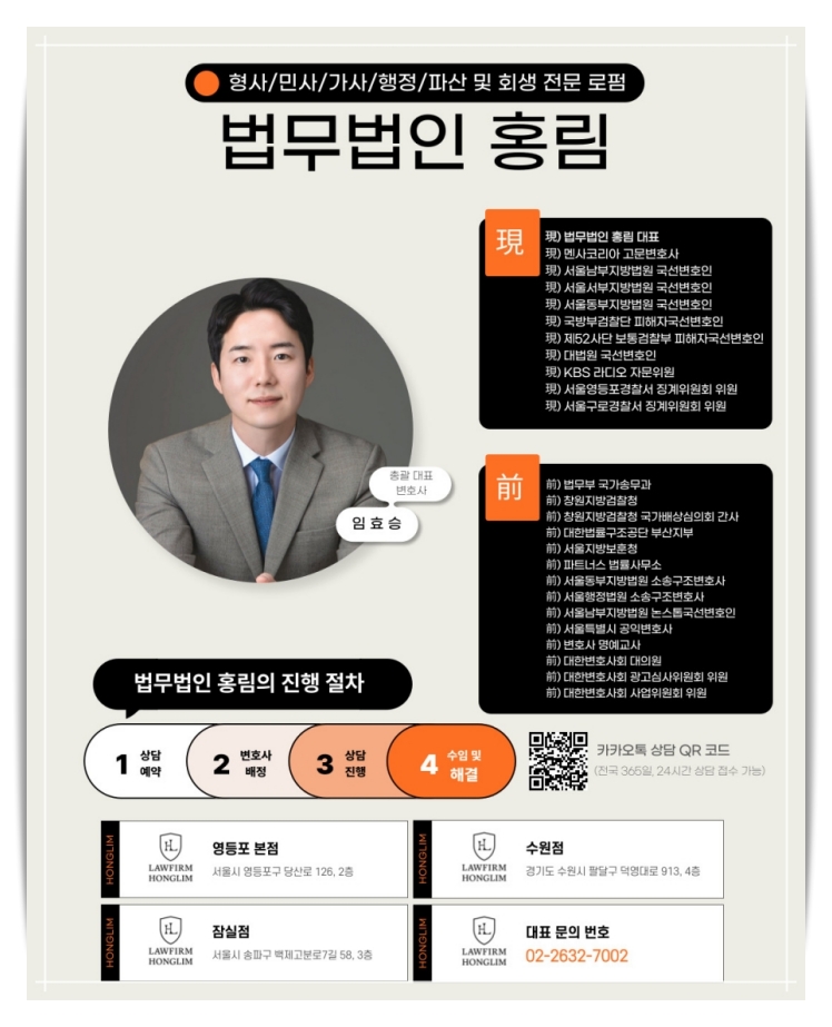 안녕하세요. 법무법인 홍림의 대표 변호사 임효승입니다. 법뭅버인 홍림은 생활 속 법률상담에서 형사, 민사, 가사, 행정소송에 이르기까지 의뢰인이 만족할 수 있도록 성심을 다하고 있습니다
