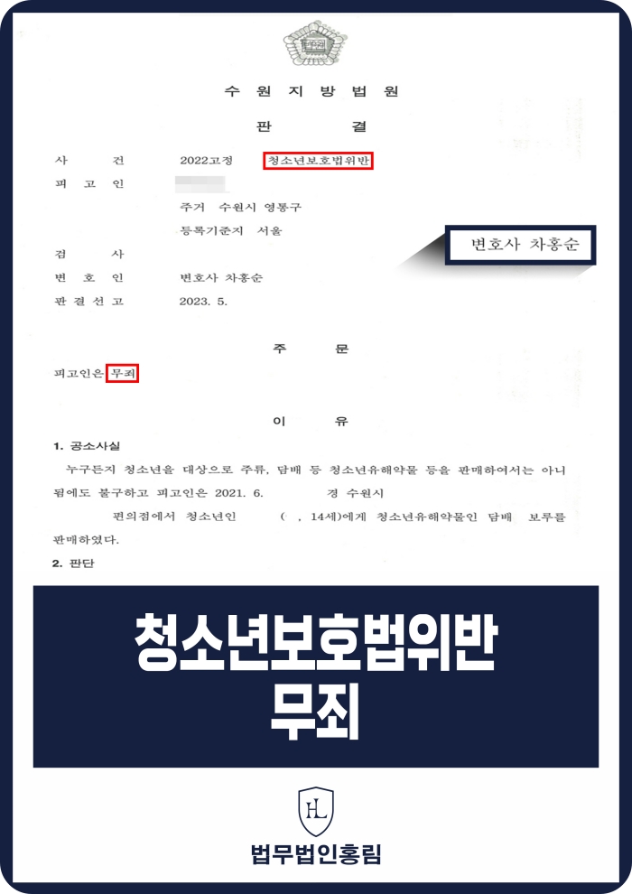 법무법인 홍림은 다양한 사건에서 청소년보호법위반 무죄 판결을 이끌어온 경험을 가지고 있습니다. 억울한 상황에서 벗어나기 위해서는 무엇보다도 사건 초기에 전문가의 도움을 받는 것이 중요합니다.
