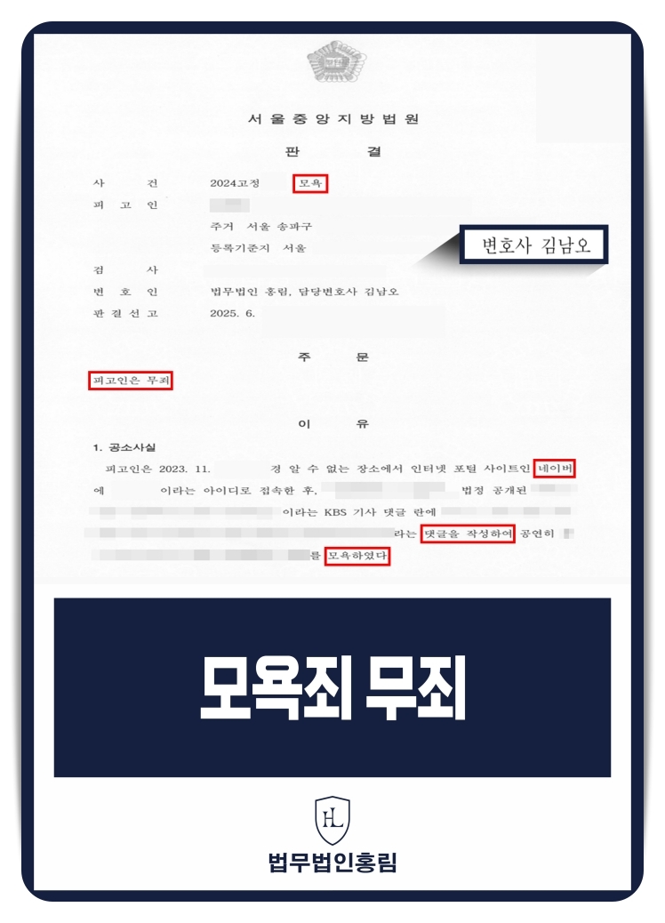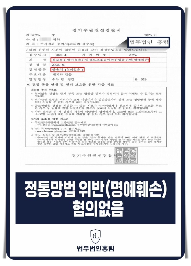 법무법인 홍림은 다수의 온라인 명예훼손·모욕 사건에서 무혐의, 기소유예, 벌금 감경 등 다양한 성과를 이끌어왔습니다.