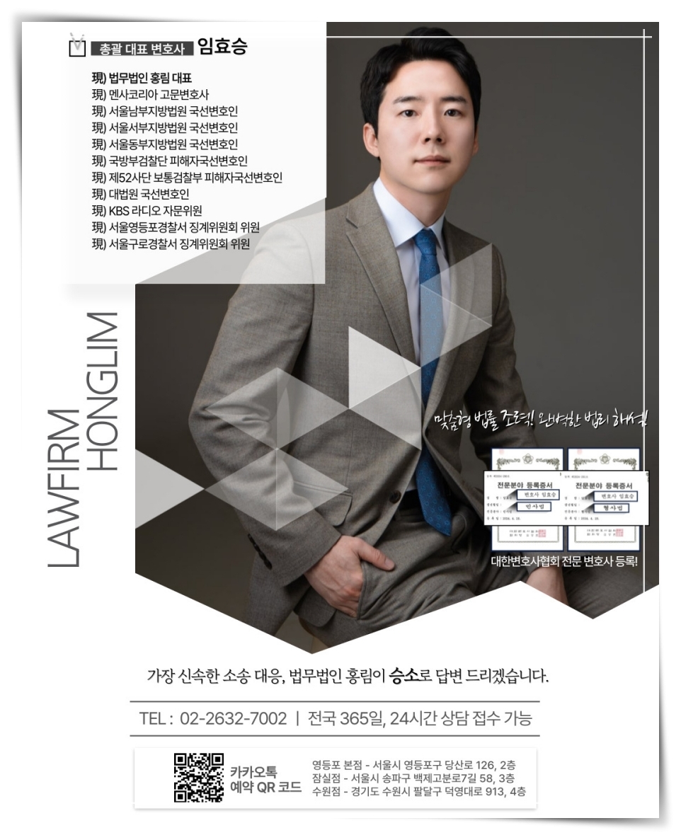 안녕하세요. 법무법인 홍림의 대표 변호사 임효승입니다. 법뭅버인 홍림은 생활 속 법률상담에서 형사, 민사, 가사, 행정소송에 이르기까지 의뢰인이 만족할 수 있도록 성심을 다하고 있습니다.