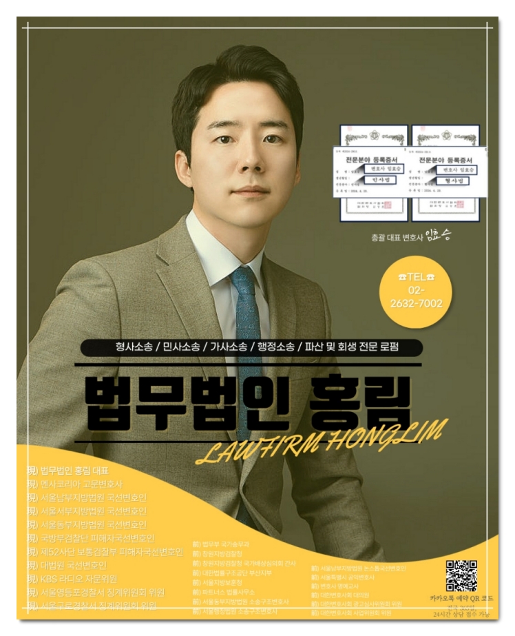 안녕하세요. 법무법인 홍림의 대표 변호사 임효승입니다. 법뭅버인 홍림은 생활 속 법률상담에서 형사, 민사, 가사, 행정소송에 이르기까지 의뢰인이 만족할 수 있도록 성심을 다하고 있습니다.