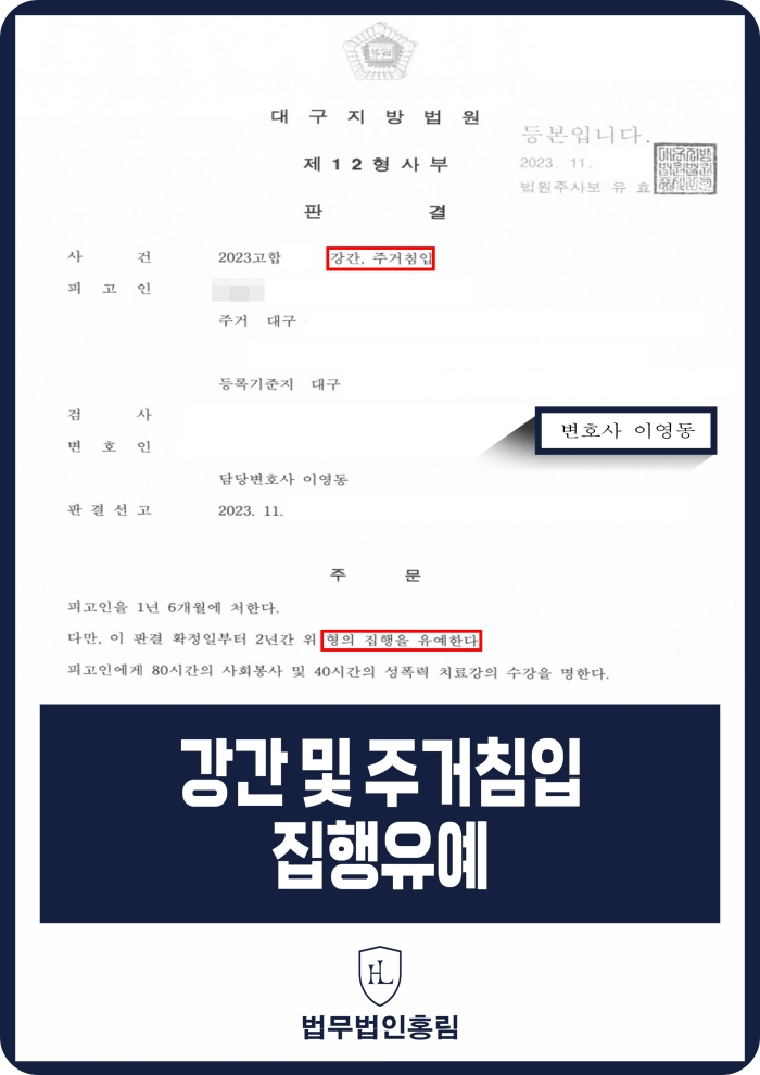 법무법인 홍림은 강간죄·성범죄 사건을 다수 수행해 온 전문 변호인단으로, 합의 전략, 반성 입증, 증거 분석, 구속 방어, 양형 전략까지 전 과정을 통합하여 집행유예를 이끌어낸 경험을 가지고 있습니다.