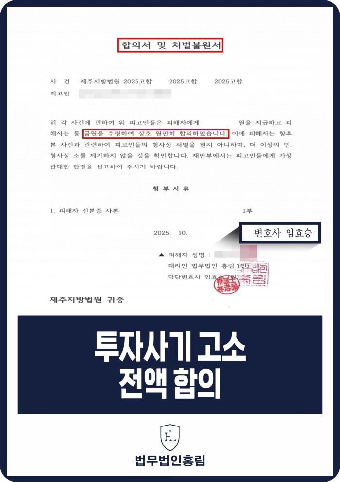 법무법인 홍림은 피해금의 전액 회수를 목표로 강도 높은 협상 전략을 펼쳤고, 결국 A씨는 투자 원금 전액을 돌려받는 조건으로 합의를 이끌어냈습니다.